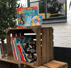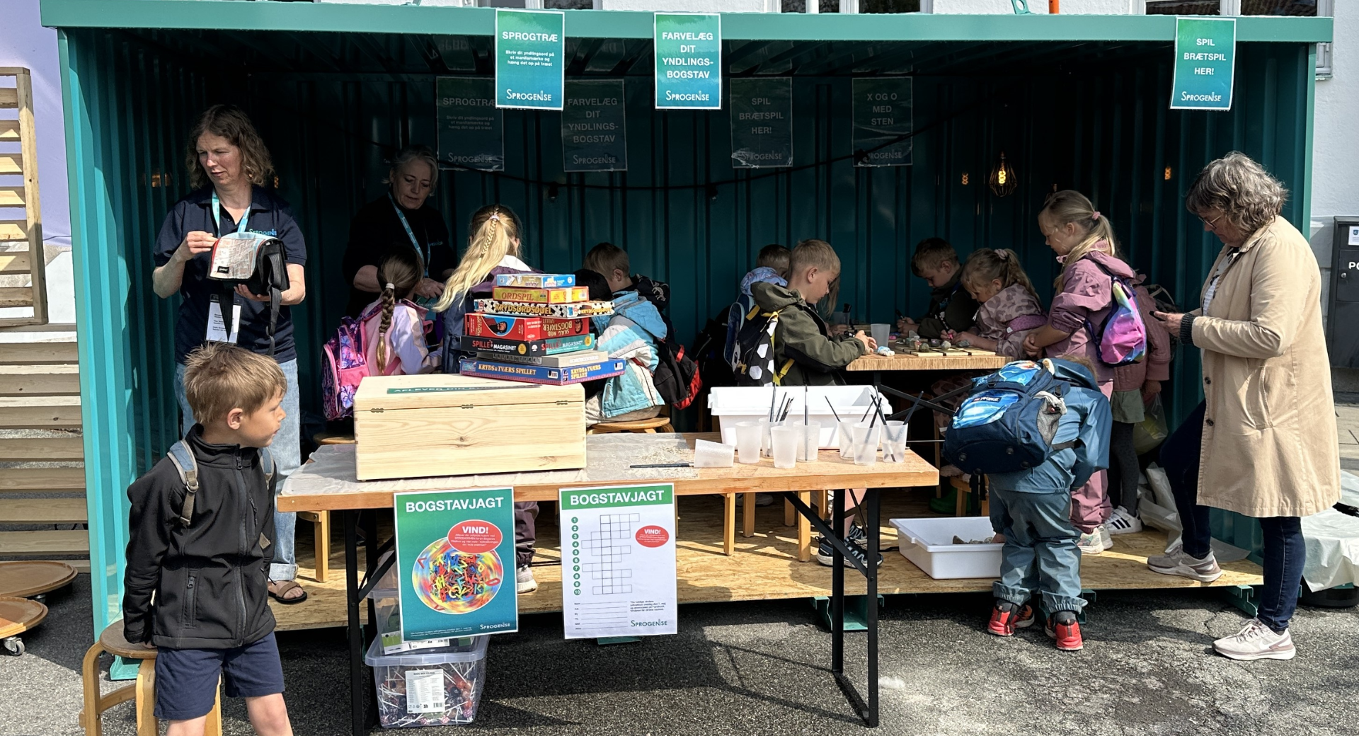 I børneområdet foran Bogense Rådhus finder du sjove og kreative aktiviteter og også opgaver der handler om fordybelse, samvær og/eller bevægelse. Alt sammen noget der inviterer børn til leg omkring bogstaver og sprog.